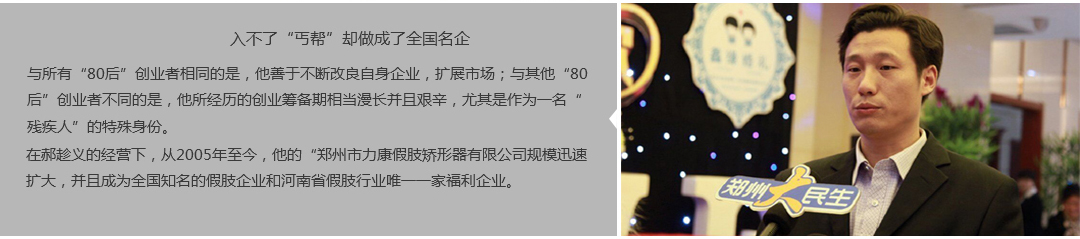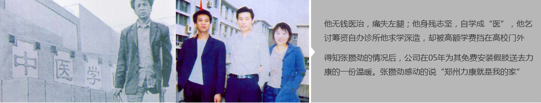 鄭州市力康假肢矯形器有限公司(簡(jiǎn)稱力康),是一家專業(yè)從事假肢矯形器的設(shè)計(jì)、研發(fā)、制作及裝 配的專業(yè)機(jī)構(gòu)。成立于1992年是河南省唯一一家福利企業(yè)。力康下設(shè)業(yè)務(wù)部、技術(shù)部、住院部、康復(fù) 部、售后服務(wù)部,并配有現(xiàn)代化的裝配車間和功能齊全的訓(xùn)練大廳,為殘疾朋友康復(fù)訓(xùn)練提供了可靠 保障。總經(jīng)理穿戴假肢多年,有著豐富的臨床經(jīng)驗(yàn)和親身體會(huì);多年來,力康已為全國幾十萬名殘疾 朋友安裝上舒適、美觀、耐用的假肢和矯形器具,使他們更大限度地恢復(fù)了正常的工作和生活?!爱a(chǎn) 品即人品”的質(zhì)量理念、先進(jìn)的技術(shù)、實(shí)惠的價(jià)格、完善的售后服務(wù)是力康取勝的法寶……